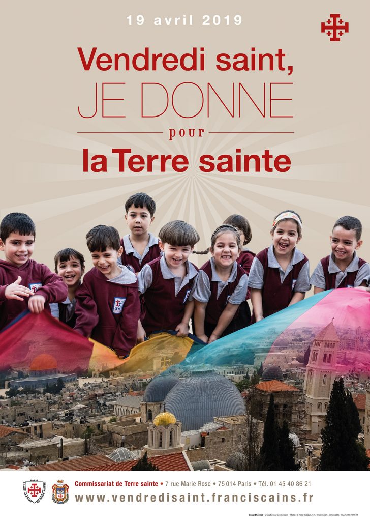 Afin de mener à bien son engagement et service en faveur de la Terre Sainte, le Commissariat a décidé, cette année, d’adresser une « Lettre du Vendredi saint » à tous les évêques de France (voir-ci contre). Cette lettre présente quelques projets qui ont pu être soutenus grâce à la Collecte (en téléchargement ici). Une affiche a également été réalisée et envoyée à tous les délégués diocésains à la Communication. Enfin, un petit clip vidéo de 2 minutes a été imaginé et réalisé avec l’aide du Centre média de la Custodie de Terre Sainte. N’hésitez pas à partager tous ces outils !
