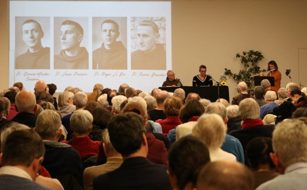 Le week-end s’achevait par une messe d’action de grâce présidée par Fr. Massimo Fusarelli au couvent de la rue Marie Rose. En ce 3ème dimanche l’Avent dit Gaudete, il invitait l’assemblée à méditer la figure de Jean-Baptiste dans sa vulnérabilité demandant au Christ : « Es-tu celui qui doit venir, ou devons-nous en attendre un autre ? ».  Les mêmes doutes certainement éprouvés par les quatre martyrs dont les portraits avaient été exposés dans la chapelle. Fr. Massimo partageait en homélie : « Le Seigneur vient à nous là où nous sommes, tels que nous sommes, dans notre besoin, dans nos luttes, avec nos doutes et nos déceptions. Il ne nous demande pas de quitter notre situation pour aller le rencontrer ailleurs. Il vient dans notre désert personnel, tout comme il est venu dans le désert de la cellule de Jean. […] Chers frères et sœurs, comme vous le savez, hier, dans la splendide cathédrale de Notre-Dame, quatre de nos frères martyrs ont été béatifiés. Ils s’appelaient – non, ils s’appellent encore – frère Gérard, frère Roger, frère Louis et frère Xavier, parce que la mort, la violence et la haine n’ont pas le dernier mot. Avec leur Seigneur et notre Seigneur, avec leur père François et le nôtre, ils sont maintenant dans la lumière et dans l’amour. Désormais tout est clair. Désormais tout a un sens, même leur mort s’est transformée en vie. Oui, il existe encore des prophètes et des témoins ! Le véritable prophète n’est pas un devin, mais celui qui, au temps de la famine et du désespoir, fait regarder vers l’avenir et rend l’espérance et la joie présentes : il devient alors sacrement de la présence de Dieu ! Comme cela est visible et tangible dans la vie de nos jeunes frères ! […] Pourtant, leur foi aussi fut durement éprouvée. Et peut-être que, pour eux aussi, l’obscurité et le froid de la nuit rendaient difficile de penser à l’espérance et à la joie… Néanmoins, ils décidèrent de rester unis, même face à la possibilité de la mort, c’est-à-dire de la vie offerte pour le Christ. »