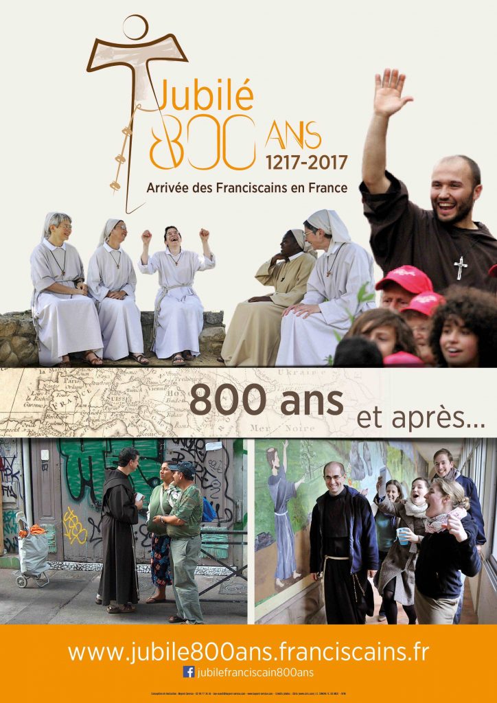 Il y a huit siècles, les premiers frères franciscains qui foulèrent le sol français n’étaient pas des experts en communication ou des spécialistes en théologie. Ils ne parlaient pas bien la langue et méconnaissaient le cadre ecclésial et social de la France mais ils ont risqué la mission. Ils ont quitté leurs sécurités pour le Christ, portés par la Joie d’annoncer l’Évangile. Du 1er mars au 4 octobre 2017, la famille franciscaine a célébré ce centenaire en mettant l’accent sur appels : “vivre la Fraternité”, “rejoindre les exclus”, “sauvegarder notre mère la Terre”, “oser la rencontre avec l’islam”, “se réjouir d’être croyant”. Parmi les temps forts de ce jubilé : des journées portes-ouvertes de la Fraternité, les 18 et 19 mars 2017 pour découvrir les réalités de la vie franciscaine, un colloque « Saint François en France » à Paris, véritable tour d’horizon des héritiers de François en France du XIIIe au XXIe siècle et une semaine missionnaire « Fraternels dans la ville » à Lyon fin novembre 2017.