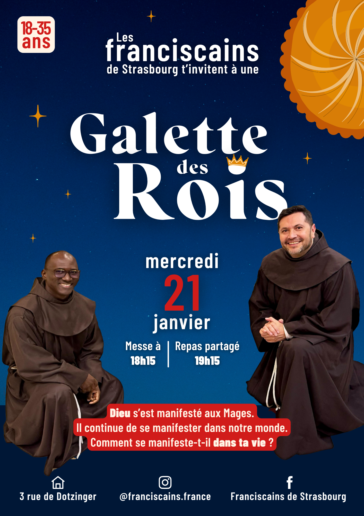 21 JANVIER – Nos frères de Strasbourg t’invitent à une galette des Rois et un temps d’échanges avec d’autres jeunes sur le thème de « la manifestation de Dieu dans nos vies ». 👑 Plus d’infos.