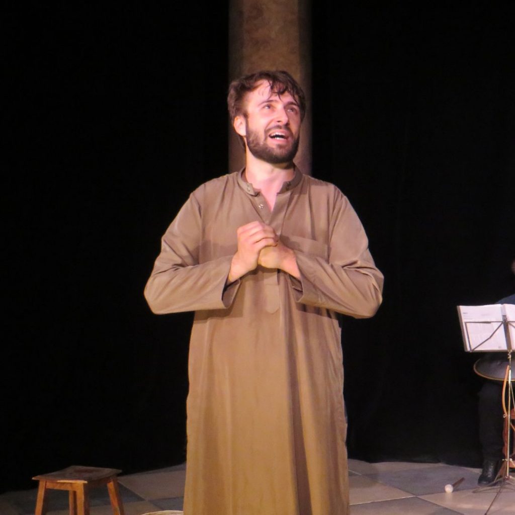 *Dans la pièce Akedia (adaptée de l’ouvrage éponyme du dominicain Adrien Candiard, par le metteur en scène Francesco Agnello), Théophile joue le rôle d’un moine ermite. L’arrivée du diable donne lieu à un dialogue entre les deux protagonistes, sur fond de notes jouées par Francesco Agnello.