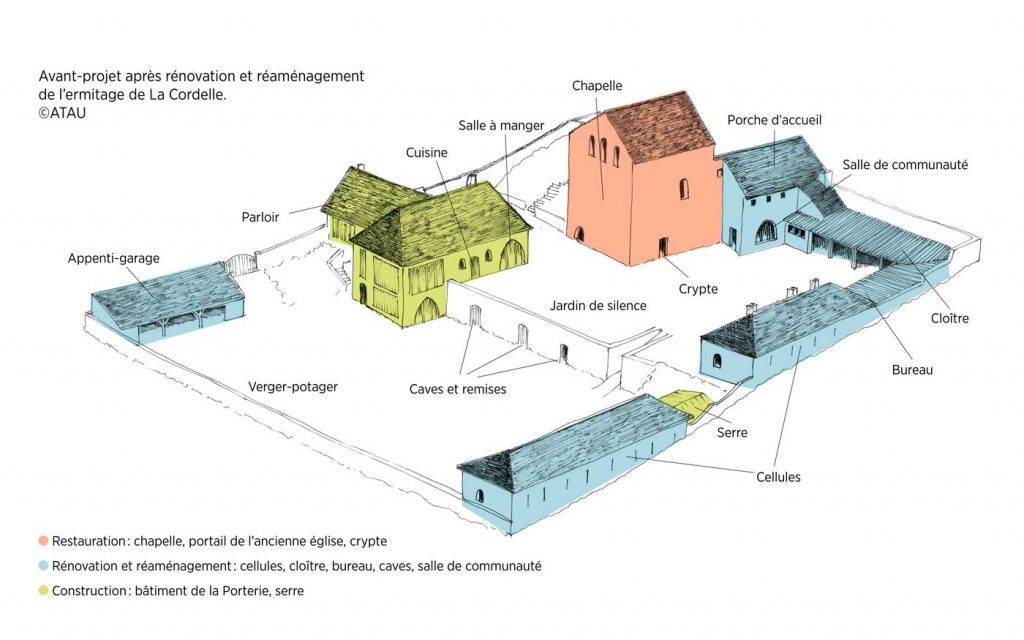 Débutant cet automne 2024 pour une durée de 2 ans, le chantier de rénovation permettra de réaménager les lieux en 3 espaces se déployant de l’ouverture au monde jusqu’au retrait et au silence propres à la vie d’ermitage :